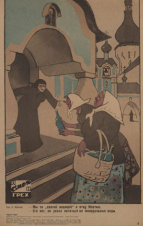 One common means of demonstrating this supposed religious hypocrisy in anti-religious propaganda was to depict priests as failing to follow the advice and commands they granted to their congregations, such as in E. A. Shukaev’s We Came for 'the Holy Water'... poster (Shukaev). The work depicts two Soviet women approaching a church with bottles, hoping the priest will gift them holy water, likely to serve some medicinal purpose (Shukaev). The nun who greets them, however, informs the women that the priest is unavailable since he is receiving mineral water treatment at a resort (Shukaev). The mention of mineral water treatment in this poster implies that the priest is utilizing the mineral water for healing, as opposed to his own holy water (Shukaev). The colors within the work are quite limited: light blue and black (Shukaev). The light blue harkens to the image of water, and is present in both the bottles and some of the church’s decor, portraying the church as the provider of holy water (Shukaev). However, the dark colors of the church, especially through the doorway of the building, convey to the audience a distrust of the church’s capability to genuinely grant the life-giving water (Shukaev). Of interesting note is the facial expressions featured in the work: the nun appears with a smile on her face as she addresses the women, demonstrating that she is unfazed by the priest’s behavior (Shukaev). Meanwhile, the foremost woman who is depicted as older than her companion has a look of surprise (Shukaev). The older woman’s age and faithfulness to gathering holy water highlights the contrast between longtime religious believers and the hypocritical clergy betraying them (Shukaev). The state hoped to illustrate that if a priest did not trust in their own power, why should the public trust in it? This method planted doubts about the spiritual capabilities of priests, in contrast to the ideas of a manipulative religio-capitalist alliance shown in older propaganda pieces.